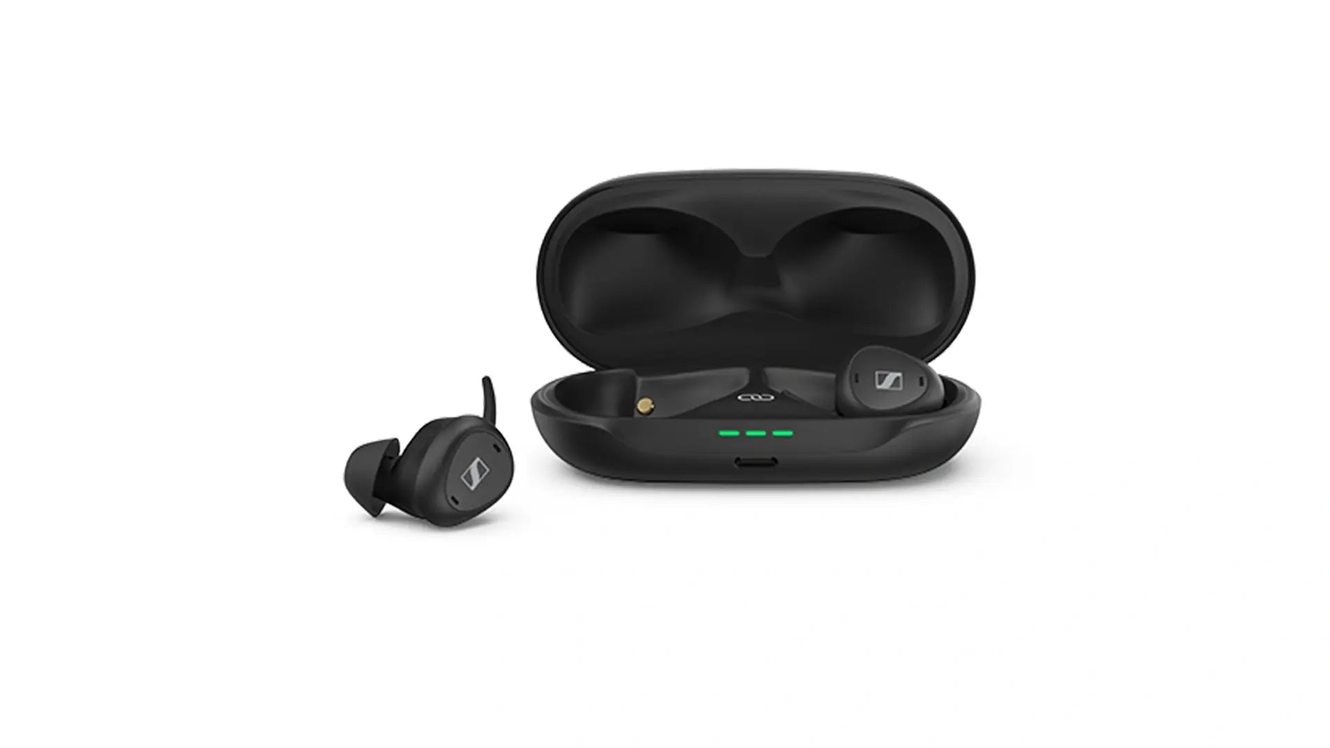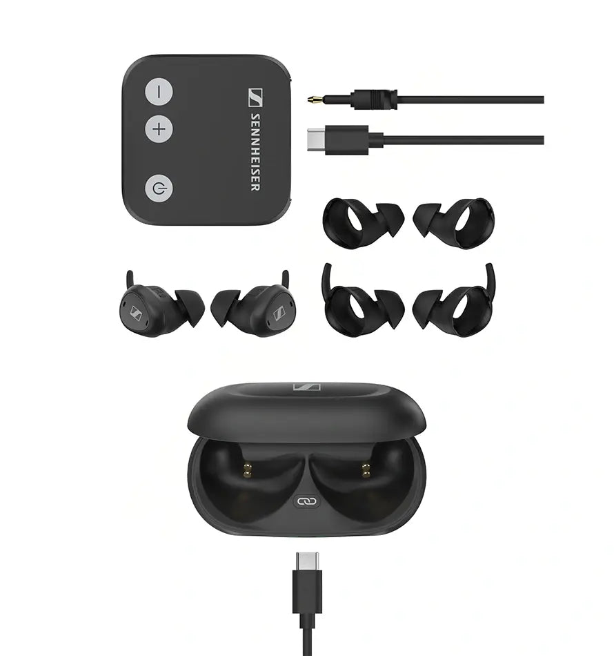 O TV Clear Set 2 inclui (1) um par de fones de ouvido True Wireless Earbuds 2 leves (6,9 g), (2) um estojo de recarga, (3) adaptadores de orelha adicionais, (4) o transmissor e todos os cabos necessários.